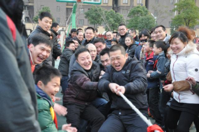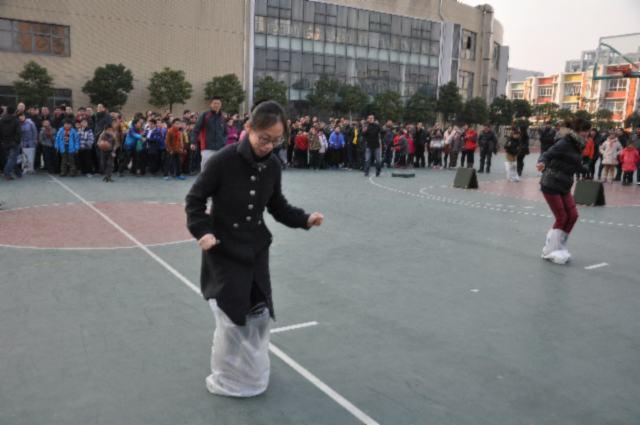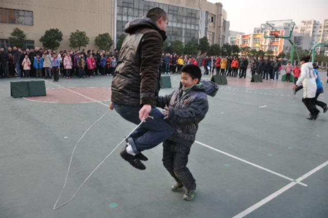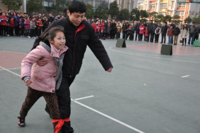 最后,各班正副班主任、两位体育教师带领家长和孩子们来到操场上,进行了孩子们期待已久的亲子趣味运动会,“二人三足”“背靠背运球”“袋鼠跳”“障碍跑”“跳长绳”“拔河”等多种项目,给每一位学生展现自我才能的机会,更使每一位孩子与家长有近距离的心灵碰撞。在活动中,家长们似乎也回到了童年,放下生活的紧张和工作的忙碌,和孩子们一起跳,一起笑,一起加油,一起助威。但在孩子们面前,他们又是家长,所以,他们坚强,他们奋勇,他们拼搏,他们用自己的行动告诉孩子们,无论何时,要勇于尝试,竭尽所能。无论是穿着高跟鞋的妈妈们,还是平日一脸严肃的爸爸们,都真真实实地给孩子们做了一次榜样,做了孩子们亲密的玩伴。最后一个集体项目 “拔河”比赛,把活动推向了高潮,将近600人在操场中把参加拔河比赛的24位家长团团围住,加油,呐喊,助威,整个操场沸腾了!因为每一位家长都清楚,今天的比赛,重要的是过程,是要让孩子明白努力的过程才是最值得关注的。在日记中,很多孩子都说:“今天的活动,让我感觉到我和爸爸(妈妈)之间的关系更亲密,我更爱的我的爸爸(妈妈)了。”