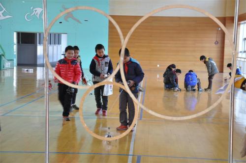 只见转圈比赛场地的选手们,一边操纵着自己的遥控器,一边眼睛一眨不眨的紧盯着那些大小不一的圈,心想着自己的飞机可以转过哪个圈呢,旁边同班级的同学也紧张的看着飞机,为自己班级的同学加油鼓劲,但又怕惊扰了自己班同学的比赛,不停的随着飞机的上下翻转而发出感叹之声。恨不得赶紧就轮到自己比赛。