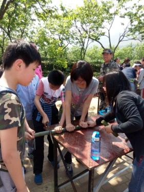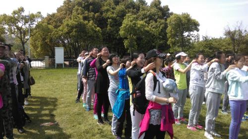 如果说,这些还只是开始的话,那么下午的活动就更有趣了。为了完成“同舟共济”这一活动,大家随机组成了三支队伍,为了在气势上压倒其他队伍,大家选队长,起队名、想口号、选队歌,排队形,每个人都激情万丈。为了取得比赛的胜利,队员们合理分工,不顾烈日的暴晒,不顾脚被勒得生疼,每个人都蛮拼的。