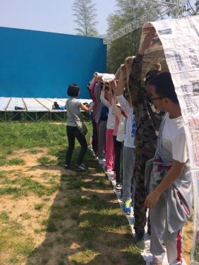 “无敌风火轮”中,三个小队将有限的报纸和胶带制作成长长的风火轮,风火轮转动的过程,就是对大家进一步合作的智慧考验。