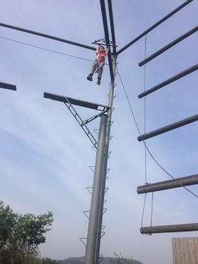 难度最大的莫过于“高空抓杠”。喜好安全绳后,需要自己爬上十多米高的铁柱,站在只容得下双脚的顶端,纵身一跃,抓住空中的单杠。尽管如此,但在大家的互相鼓励之下,大家都战胜了恐惧,赢得了一阵又一阵喝彩的掌声,成为了大家眼中的英雄。