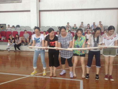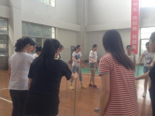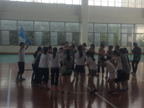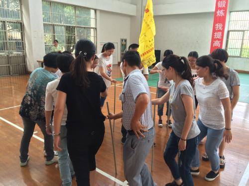 时针指向下午两点。“好,全体老师,集合!!”伴随着素拓师的一声令下,素质拓展训练即将褪去它神秘的面纱。见到了素拓师,全体辅导员老师们都自觉地转换了角色,变成了训练营中的需要学会听从指挥、团结协作的队员。在教官严格指令的压力之下,辅导员们有序地分成了四小分队,并瞬间智力大爆发,不到八分钟就设计好了各队的队旗、队徽、队名、队训,并完成了全体队员的签名。在接下来的150秒挑战中,每个小队要完成四项挑战,分别是解手环、能量传递、不倒森林和最棒的掌声。各个小队都在队长的指挥下,紧锣密鼓地练习,准备,不断地调整、改进,将挑战任务做到稳中求速。最后的计时赛中,“超能队”最终以2分2秒的成绩夺得了桂冠,“双鹰队”由于在不倒森林环节连续出错,不得不重新挑战,但仍能快速调整心态,完成了挑战。两个小时的时间如白驹过隙,全体辅导员们都收获了汗水和欢笑。