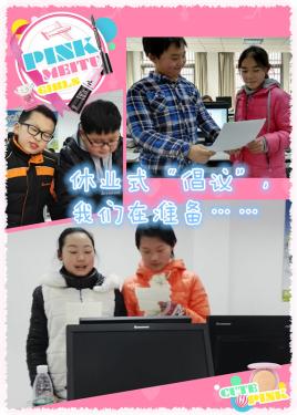 1月20日上午8:30,六个项目组的组长和组内骨干成员齐聚学校电脑室,开始了“加班”工作。大家首先对自己组的“作业倡议书”再次进行了细节上的完善:一个用词,一点对署名的格式调整……接着,便商量着策划本项目组在休业式上的现场汇报并立即分工开始做准备工作:先做介绍用的ppt,同鞋们那一个个老专业啦!从新建文档到添加文字内容和图片再到添加效果,那水平没得说了,谁让咱在平时的“幸福作业”中早就操练得很娴熟呢!再准备台词,进行排练,顿时,整个电脑室弥漫着朗朗台词声。这时,信息技术超好的小顾同学情不自禁地举起了相机,同学们就更加精神十足啦!各小组还计划着通过一些表演、示范的方式帮各年级学生突破作业中的重难点呢!