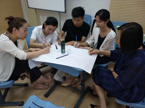 下午的活动更引人入胜。通过“小组演演猜猜”“伸直手臂吃糖”等游戏体验“合作”价值观的引导;通过语言描述创设情境、讲故事、小组合作、移动座位写下如何做到“尊重、重视、安全、被爱、理解”这五个核心的价值观并且分享他人的经验再写下自己的关键词;通过想象创设情境,体验“容忍”价值观的引导,一个花园中有不同花,就如班级中有不同的学生,我们必须尊重这个花园,教孩子正确的价值观,建立氛围,通过想象进入教学空间,交换立场……没有了手机的干扰,每一个学员专注而投入,思维不断发散、碰撞,每个人都沉浸其中。