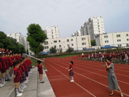 随着一位老师和一位同学的新新主持人组合的上台,龙虎塘实验小学的开学典礼正式拉开了序幕。首先请出了本周的升旗班级二(5)班的同学们和升旗手夏子鑫、王雅萱和印荣琪,由他们为大家进行自我介绍,他们骄傲自豪的介绍着自己的兴趣爱好,让我们看到了龙虎塘实验小学的小学生们阳光开朗的心态。而台下的一年级小朋友,听着大哥哥大姐姐的自我介绍,望着他们那胸前飘扬的红领巾,眼中尽是对美好小学生活的向往。接着由二(5)班的同学们带来班级展示---班歌《金色童年》,那动听悠扬的歌声响起,现场所有人都沉浸在那金色童年之中,歌声中饱含着龙虎塘实验小学二年级五班全体同学们对童年的美好向往和热爱,更是展现出了龙虎塘实验小学阳光、文雅、灵动的学生形象。那歌声触动着心弦,歌声一停,现场掌声雷动。接着龙虎塘实验小学盘龙校区的顾校长为升旗手授光荣带并颁发证书,我想这光荣的一刻会永远铭刻在他们的金色童年里。