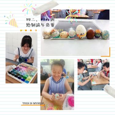 活动初期,班主任们统一开展了“话端午”主题班会,从端午的简介、由来、民俗等方法了解了端午。这节班会,也是特色活动的一个启动仪式,打开了系列活动之门。随后,各班根据班级情况、学生喜好,参考家长意见,开展了缤纷的个性化端午活动。四1班制作驱邪纳福香囊,四4班制作艾叶香包,学生们在穿针引线中,缝出了端午的吉祥如意;四2、四8班画端午彩蛋,学生们彩笔挥舞中,画出了端午的缤纷多姿;四3班举办端午研学会,学生个个化生“小学究”,专业地介绍自己的端午研究报告。四5班开展端午赛诗会,童言声声传诵端午经典。四6、7班玩转端午五色线,彩线在指尖飞扬,编制蛋兜、长命缕。四9、10班举行亲子端午联欢会,在欢声笑语中共度假期。四11班包粽子,品粽子,粽叶飘香传真情。个性活动结束后,老师们指导学生用手抄报、作文等总结活动,在总结中加入自己对端午的研究成果,活动感悟,提升了活动价值。