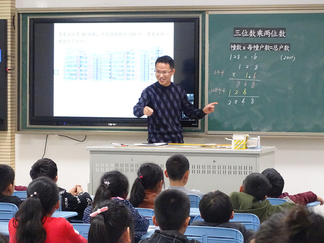 第二节课是操锋老师执教的《三位数乘两位数》。操老师课前安排了两位数乘两位数计算的复习,帮助学生回顾算理和算法。随后通过生活情景引出三位数乘两位数的计算,引导学生在先估后算再验算的过程中,逐步掌握算法。尤其在互动交流过程中,操老师注重借助情境让学生掌握对算理的理解。并通过多元资源的对比,帮助学生逐步掌握三位数乘两位数的计算方法。