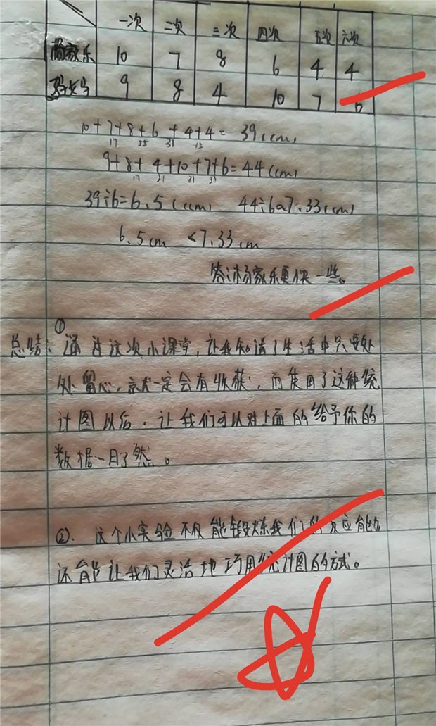 改变了传统的数学任务,改变了活动参与的对象,学生们的研究热情高涨,群里不断发来大家研究的图片、视频,学生或用统计表、或用统计图、或算平均数分享着自己和爸爸妈妈的比赛成绩。生活中、工作中离不开统计,从连续的疫情情况报道足见统计应用的广泛性。本次亲子数学游戏让学生完整地经历了统计研究的全部过程,从“收集数据”到“统计数据”,再到“分析数据”,同学们再一次加深了对统计的理解。以本次活动为引子,更是鼓励学生主动应用统计的方法了解当然疫情的变化。活动中,学生还收获了一些研究的小“道理”。比如“不断实验中要不断总结经验”、“一开始的落后惧怕不断的坚持”、“动手中才更容易出真知”……这些小哲理正是研究中可贵的品质。