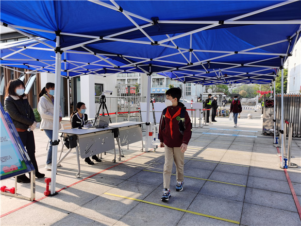 学生陆续走入校园,在校门口接受红外测温仪测温,在值岗老师的引导下按指定路线进入教室。进入教室,副班主任再次测温,记录。晨会课上,班主任指导孩子在校一日流程,如正确佩戴校园准入证,如厕,饮水,用餐及课间注意事项。