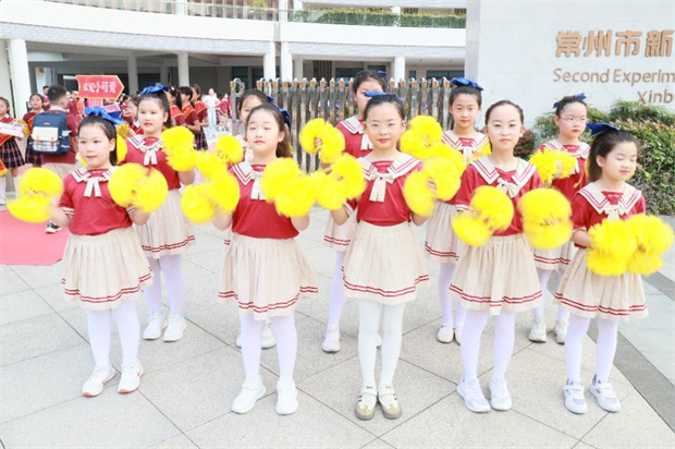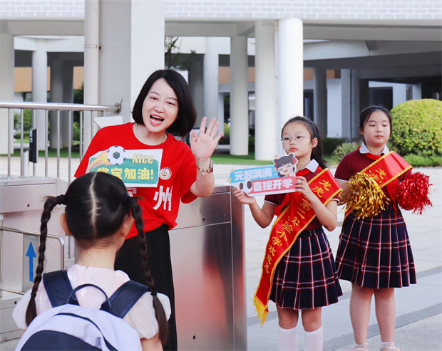 晨光微熹,秋风裹着梧桐叶的私语轻拂校园。弘雅少年踏着欢快的序曲,肩头书包如振翅雏鹰般跳跃,步履轻盈地迈入校门。校门口,身披红绶带的礼仪队员眼眸亮如星子,以清脆童声向同伴传递新学期的祝福;红毯两侧,校长们身穿红色苏超常州队应援服,手拿应援手持牌,笑容温暖,俯身与孩子们击掌、问候,掌心的温度漾开阵阵暖意。