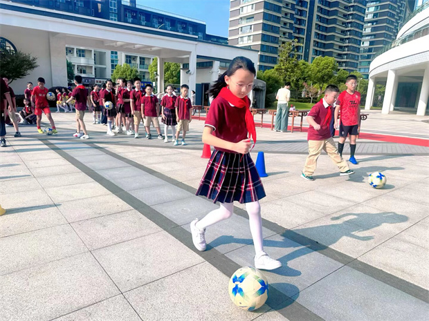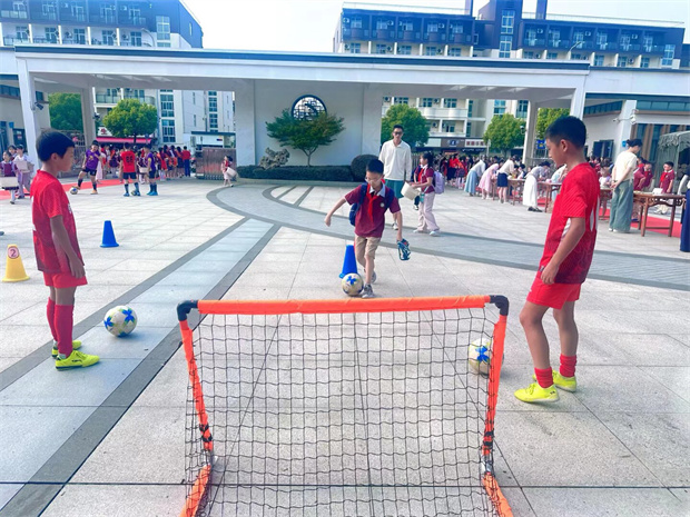 热闹的校园里,足球互动体验区聚着一群小球迷。他们精神抖擞,控球、射门样样尝试,惹得周围小伙伴助威呐喊声此起彼伏。小小的身影在场地间跃动,尽情挥洒活力,也真切感受着苏超般的足球热情。