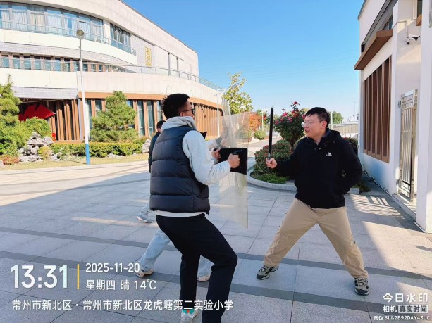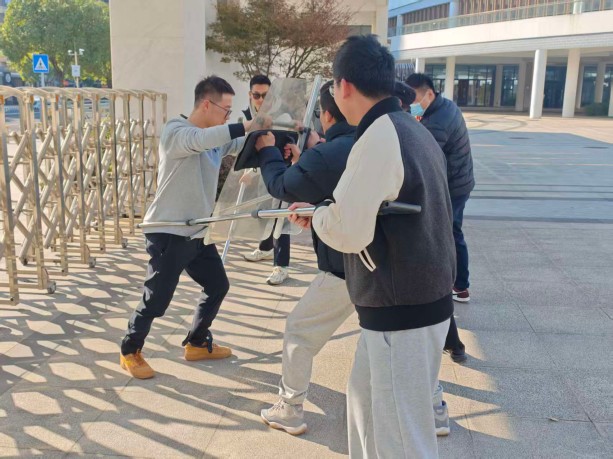 培训伊始,应急小分队成员在门卫区域围绕盾牌、钢叉、阻车器三类核心防暴装备展开实操训练。老师们认真练习持盾戒备、钢叉束缚、阻车器快速布设等关键动作,反复打磨操作细节,在规范流程的同时强化团队协作默契,为应对突发情况夯实基础。