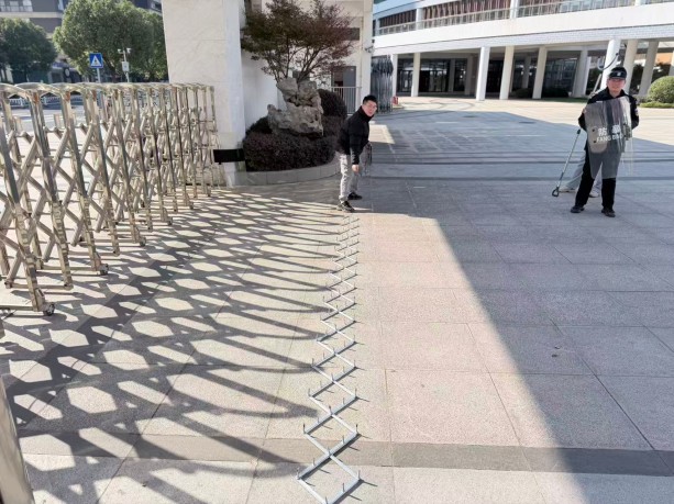 场景一:歹徒驾车冲撞校门,预警发出后,王鑫老师第一时间携带阻车器在门卫指定位置快速展开布设,尖锐倒刺迅速形成拦截防线,其他应急队员在门卫室周边集结待命,手持器械做好戒备,随时准备处置后续情况,整个过程反应迅速、衔接顺畅。